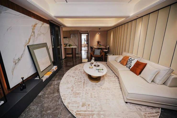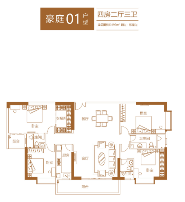 再看建面约192㎡东南向双主套四房,空间阔绰感简直不要太满。餐客厅与阳台直通,大气奢阔,采光通风一流,即便是举办一场多人的party也不在话下。