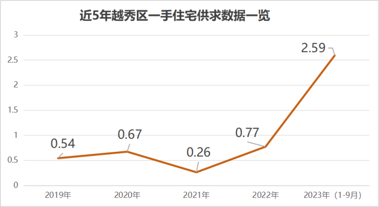 中指院数据显示,2019-2022年间,越秀区一手住宅供求比均低于1,甚至低至0.26。也就是说,约平均每1套房就有4个人争抢。