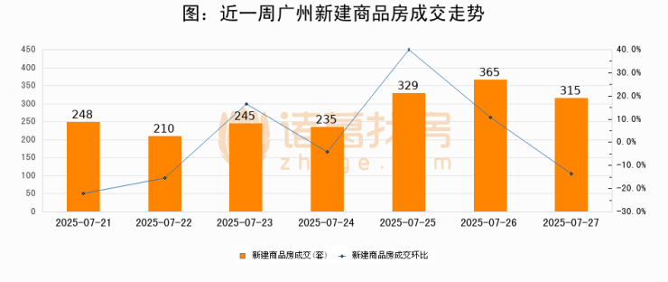 根据广州市住房和城乡建设局数据显示,2025年07月27日广州新建商品房成交315套,较昨日减少50套,环比下降13.7%