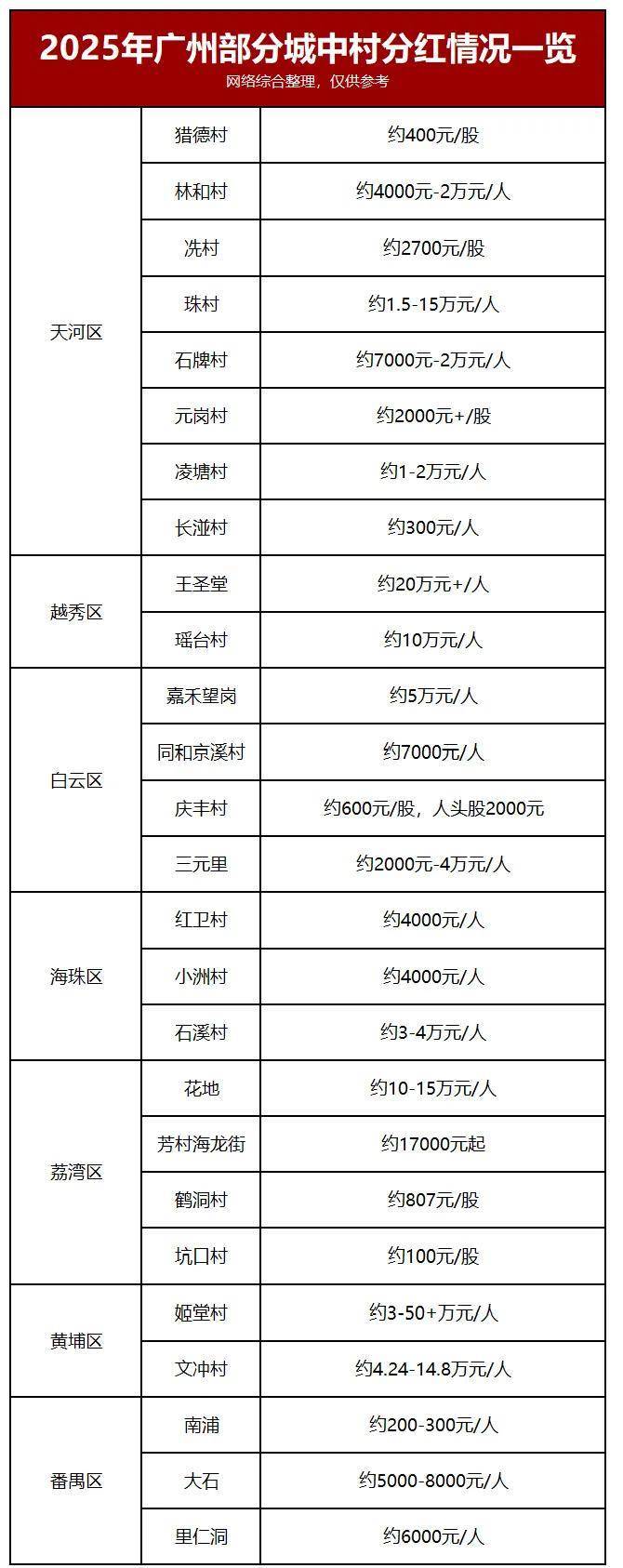 近日,猎德、文冲、林和、石牌等多个城中村陆续公布年度分红方案,看得人眼红心跳。而在这波“分红潮”中,最抢眼的莫过于天河冼村——2025年全年股份分红每股人民币2700元。与其他一些村庄每股11元的分红水平相比,差距可谓显著。
