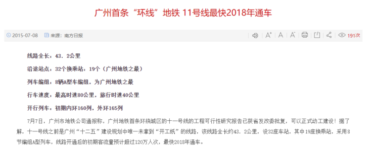 早在2015年7月7日,广州市地铁公司通报称,11号线的工程可行性研究报告已获省发改委批复,可以正式动工建设。线路最快于2018年通车。