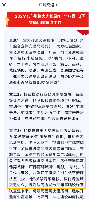 在昨日(3月14日)2024年广州市交通运输工作暨交通运输行业安全工作会议上,官方明确2024年,广州将尽快开通运营佛莞城际、广佛南环城际、地铁11号线、3号线东延段,积极打造世界级轨道交通体系。