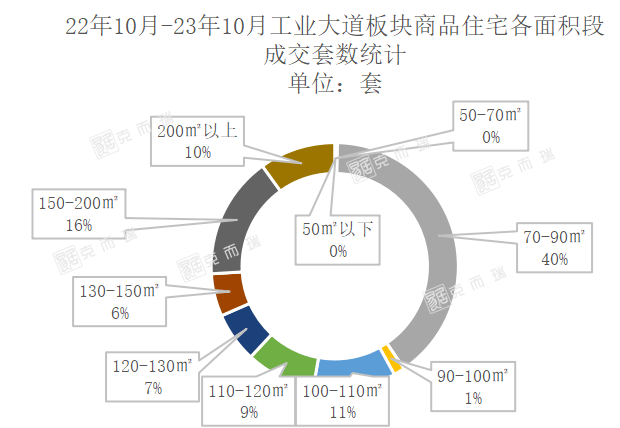 与东圃板块一样,22年10月-23年10月工业大道板块商品住宅的主力户型为70-90㎡,共成交331套,占比达到4成。