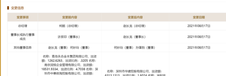 工商资料显示,8月17日恒大地产集团进行了相关工商登记变更,恒大集团董事长由许家印变更为赵长龙,总经理、法人也从柯鹏变为赵长龙,柯鹏仍任地产集团总裁。接近恒大人士向华尔街见闻表示,此项变更系借壳深深房A回A股终止后的正常变动,未涉及具体管理架构、股权的变化。