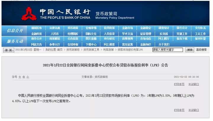 中国人民银行授权全国银行间同业拆借中心公布,2021年3月22日贷款市场报价利率(LPR)为:1年期LPR为3.85%,5年期以上LPR为4.65%。以上LPR在下一次发布LPR之前有效。这已是5年期以上LPR保持11个月没变化。