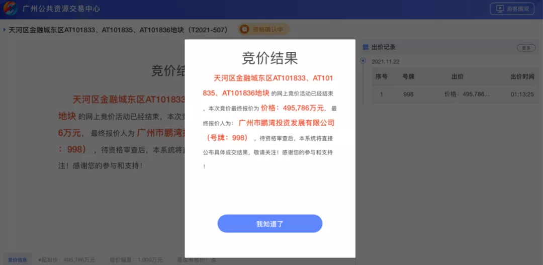 11月22日上午,鹏瑞地产旗下广州市鹏湾投资发展有限公司以总价495786万元,折合楼面价约18300元/㎡,夺得金融城东区一宗商业商务混合用地。