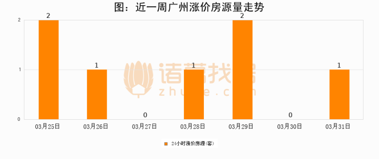 根据诸葛找房数据显示,广州24小时涨价房源量为1套,较03月30日增加1套,环比上涨0%。与此同时,涨价房源占比小幅扩大,业主信心有所提升。