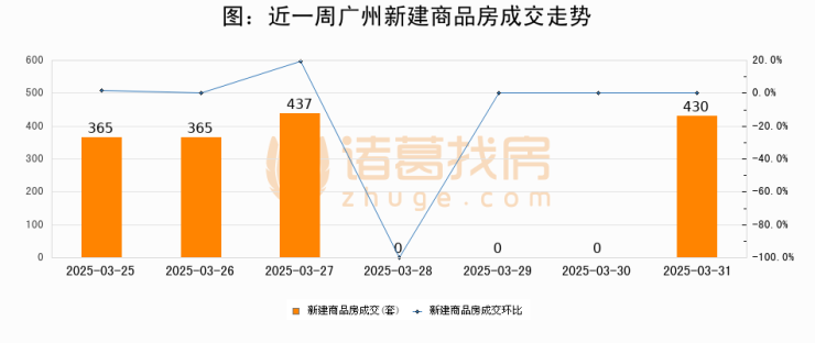 根据广州市住房和城乡建设局数据显示,2025年03月31日广州新建商品房成交430套,较昨日增加430套,环比上涨0%