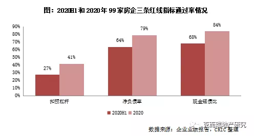从三个指标的通过率来看,均有明显的提高。2020年底现金短债比的通过率较高,达到了84%,相比2020年上半年提高了16个百分点;此外净负债率通过率也同样较高,达到了79%,比年中提高了15个百分点。相较之下,剔除预收款后的资产负债率的通过率仅有41%,多数房企仍未达标,但相比年中仍有14个百分点的提升。