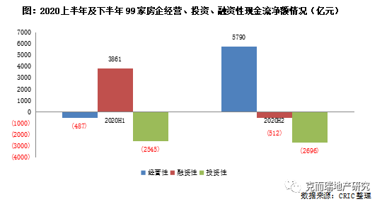 若从99家房企2020年上半年及下半年经营、投资、融资性现金流净额变化来看,可以看出大多数房企于下半年加强销售回款、控制投资,经营性现金流由负转正至5790亿元;而投资性现金流基本保持持平。与此同时,融资性现金流净额呈现为净流出,侧面也说明房企加大了债务偿还力度。