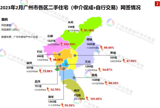 从广州市房地产中介协会的数据可见,2023年2月(统计周期为2023年1月26日至2023年2月25日),广州市二手住宅整体(中介促成+自行交易)共网签9938宗和96.22万㎡,环比分别增长78.68%和74.63%,创下2021年6月以来新高。