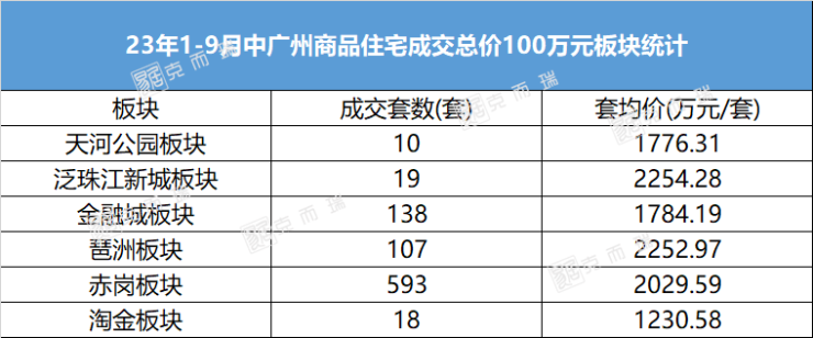 可以看到,全市共有3个板块套均价在2千万以上,其中天河区珠江新城一套2254万元总价位居全市最高,第二位是琶洲板块2252万元,第三则是赤岗板块2029万元。