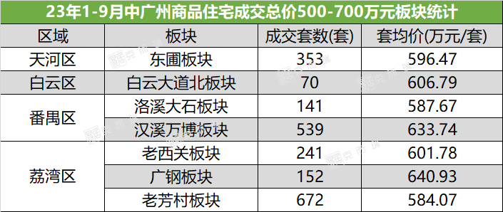 数据显示,该总价段置业热门板块在荔湾老芳村板块,今年1-9月中共成交672套,成交主力来源于万汇天地曦府项目,成交均价55074元/㎡。番禺万博板块以539套次之,成交主力来源于越秀·瑞麓府,成交均价48024元/㎡。