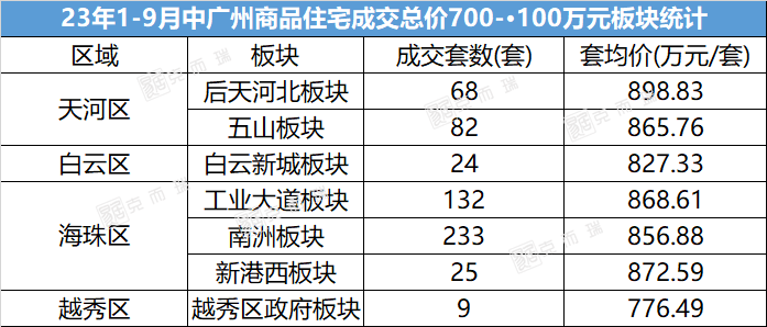 可以看到,该总价段置业热门板块在海珠区南州板块,今年1-9月共成交171套,成交主力来源于珠光海珠新城,成交均价68641元/㎡。工业大道板块132套次之,成交主力来源于中海观澔府,成交均价77332元/㎡。