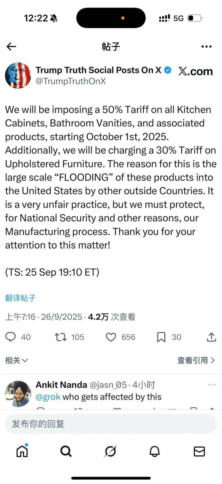 当地时间9月25日,特朗普相关社交平台账号发布消息称,自2025年10月1日起,美国将对所有进口厨柜、浴室柜及相关产品征收 50% 的关税,同时对软垫家具征收 30% 的关税。