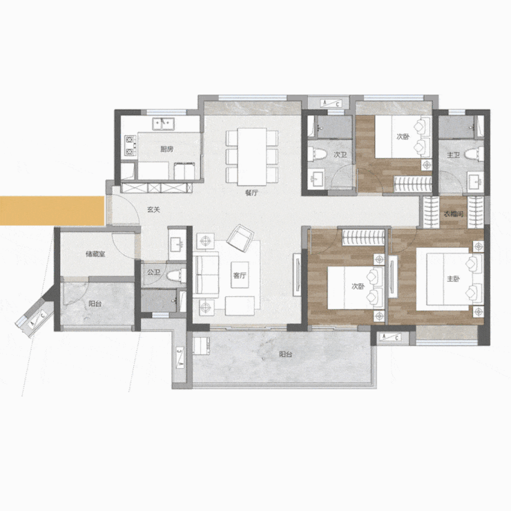 更惊喜的是,这款户型做到了双主套,可以说无论是四代同堂还是家有三孩的家庭,均能满足其生活所需。