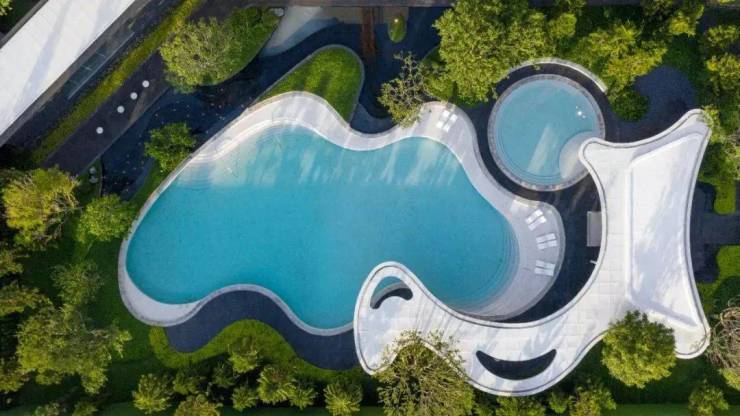 如:近1000㎡的双泳池,不仅打造了成人泳池、儿童泳池,还设置了休闲廊架、消毒池…