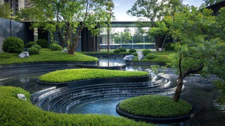 流动的层叠水景、蜿蜒的绿化分布在沿途会客厅。除了观赏性之外,给人的感觉是柔和的、自然的。