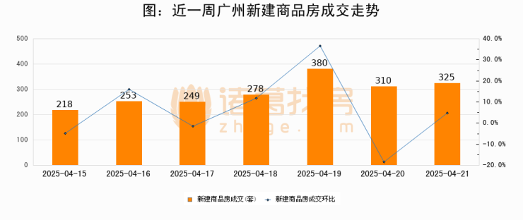 根据广州市住房和城乡建设局数据显示,2025年04月21日广州新建商品房成交325套,较昨日增加15套,环比上涨4.8%