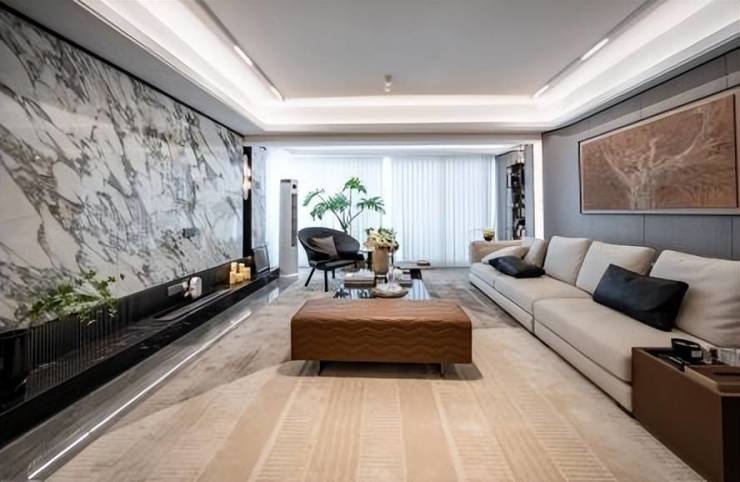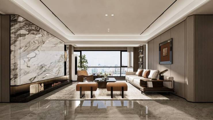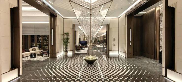 超6米的入户大堂——高约6.3米入户大堂,采用的是高级石材和碳晶木饰板;