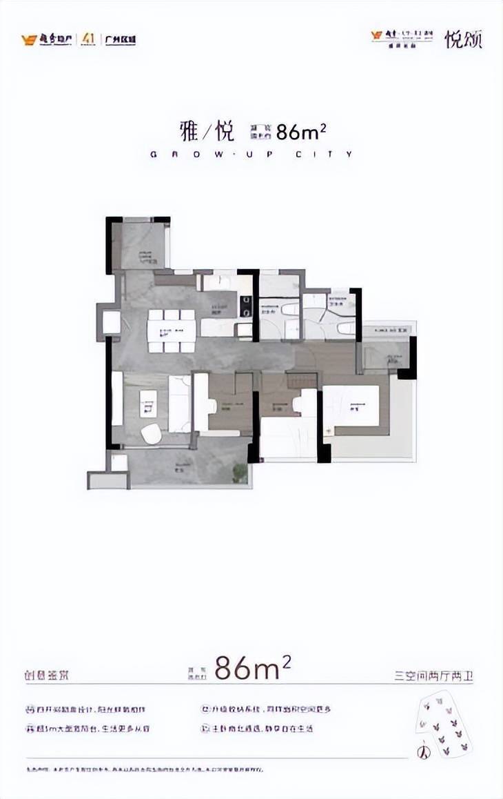 建面约86m²三空间两卫户型,约5.4m大阳台、约21㎡酒店式主套,再加上270度无立柱景观,集齐所有户型的优势,能够媲美市面上约建面约110㎡户型配置。