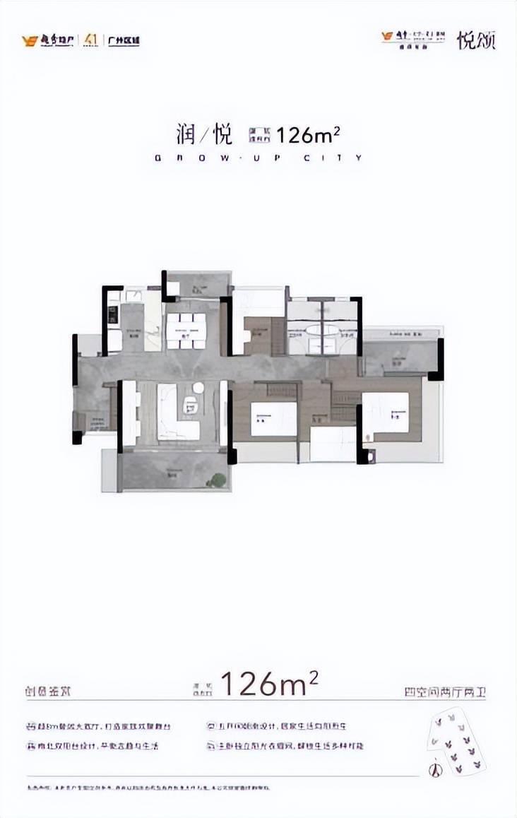 建面约126m²四房两卫是南北对流双阳台设计,南北通透,尺度开阔,堪比市面上建面约140㎡以上的豪宅。