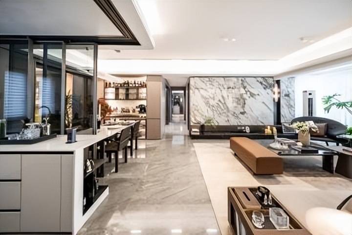 超6米的入户大堂——高约6.3米入户大堂,采用的是高级石材和碳晶木饰板;