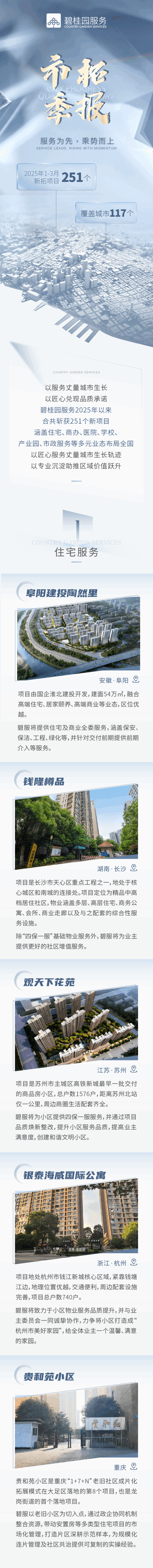 2025年第一季度,碧桂园服务以强劲发展势头实现市场拓展"开门红"。截至3月31日,碧桂园服务集团覆盖全国117个城市,成功签约251个优质项目。