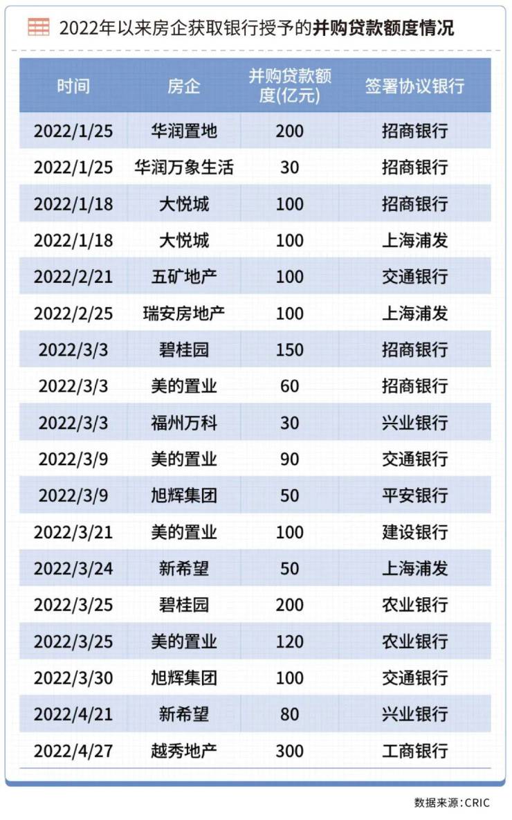 值得关注的是,自去年底并购贷款被主管部门首次提及,明确金融支持出险房企项目“收并购”。2022年以来,房企连续获得并购债、并购贷款支持。4月,监管机构鼓励AMC(资产管理公司)、银行参与出险房企项目收并购。收并购已成为当前风险化解的重要手段之一。