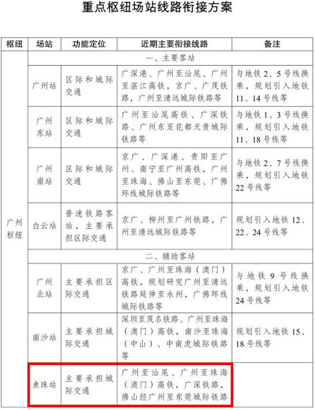 再看随同批复文件公布的《重点枢纽站场线路衔接方案表》中,“鱼珠”枢纽站近期主要的衔接路线为:广州至汕尾(即广汕高铁)、广州至珠海(澳门)高铁(即广中珠澳高铁)、广深铁路、佛山经广州至东莞城际铁路(即28号线)。