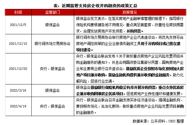 2021年12月5日,银保监会指导金融机构重点满足首套房、改善性住房按揭需求,合理发放房地产开发贷款和并购贷款,并购贷款被首次提及;10日交易商协会举行房地产企业代表座谈会,优先支持注册发行债券用于并购及项目建设,房企并购票据迎来政策突破;20日央行、银保监会联合印发《关于做好重点房地产企业风险处置项目并购金融服务的通知》,鼓励优质房企按市场化原则并购出险房企项目,鼓励金融机构提供并购金融服务,其中提到对兼并收购出险和困难房地产企业项目的并购贷款暂不纳入房地产贷款集中度管理,加速银行并购贷款的投放。进入2022年为调动房企收并购积极性,1月据市场消息称,针对出险房企项目的承债式收购,相关并购贷款不计入“三道红线”相关指标。3月16日六部门密集表态房地产,再次强调金融机构稳妥有序开展并购贷款。
