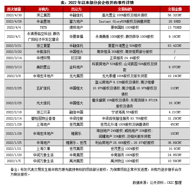 自2021年下半年开始,随着部分房企流动性危机的出现,出险房企急于打通项目股权出售渠道,市场上的并购机会逐步增多。与此同时,监管层鼓励并购贷款、并购票据等金融融资工具用于行业出清、房企出险,对房企进行收并购起到了正面推动作用。