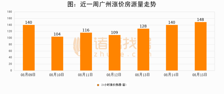 根据诸葛找房数据显示,广州24小时涨价房源量为148套,较08月14日增加8套,环比上涨5.7%。与此同时,涨价房源占比小幅扩大,业主信心有所提升。