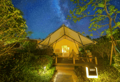 现如今,广州花都木莲庄酒店已经推出全新二期新品——“野奢帐篷客房”,将人们回归自然的渴望与奢华的住宿体验融为一体,创新性地带来兼具趣味、品位与艺术感的野奢旅居生活,让都市人远离城市,亲近自然,释放身心压力。