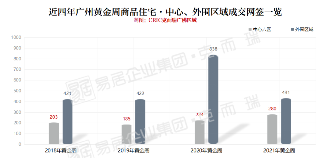 据克而瑞市场监测,2021黄金周广州中心六区(含黄埔区)在7天内网签成交总计280套,占比39.4%,值得一提的是,今年黄金周中心六区的成交量为近四年较高的;而今年国庆外围区域网签成交431套,占比60.6%。