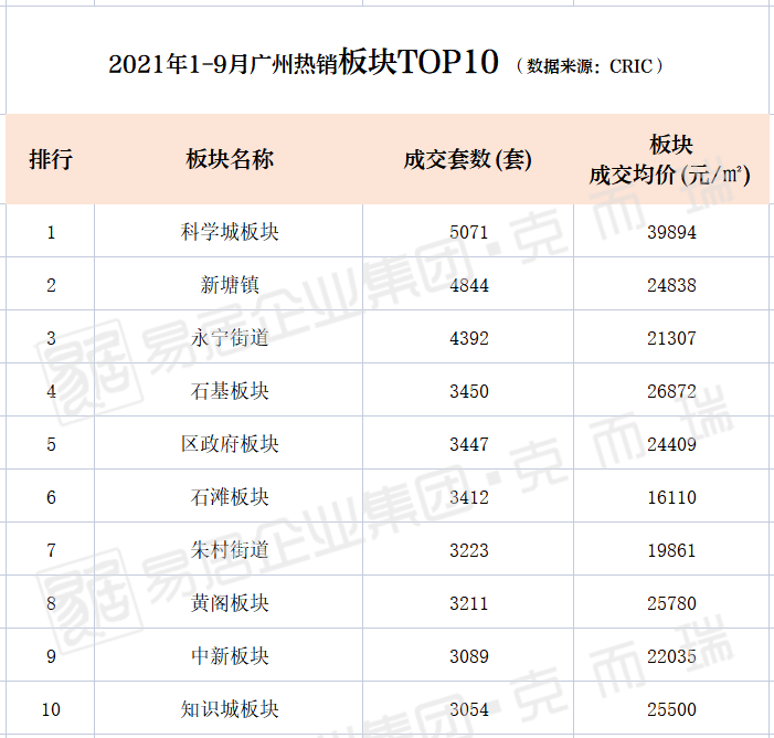 总结一下1-9月热销板块TOP10,据克而瑞数据统计,科学城在今年1-9月以5071套成交,排名全市板块排名前列,目前该板块成交均价为39894元/㎡,并且是TOP10板块中少有一个冲4字头的。此外,新塘镇和永宁街道分别以4844套、4392套,紧随其后!