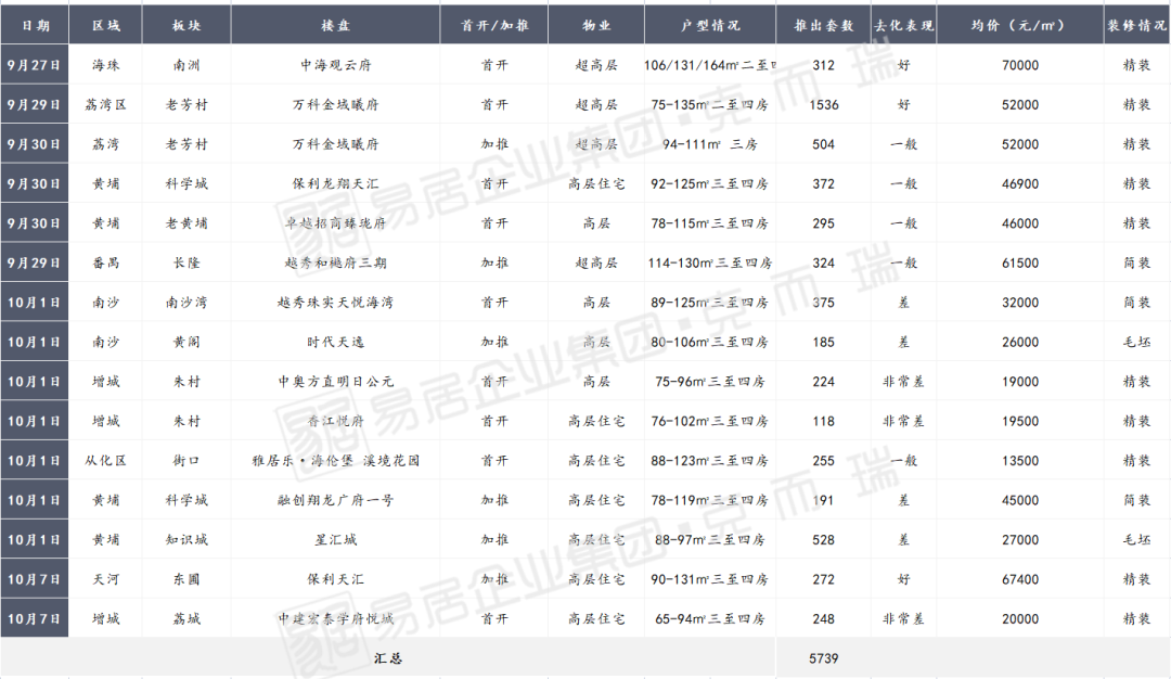 克而瑞统计到,在黄金周前后节点,广州全市累计推售15盘,总计开盘加推5739套,认购2564套,平均去化率45%,整体销售去化表现一般!由克而瑞城市分析师监测到,其中有3盘去化表现好,分别为中海观云府、万科金域曦府以及保利天汇。值得一提的是,万科金域曦府,由于地段较好等因素,在29日首开1536套后,连忙在隔天又加推504套。