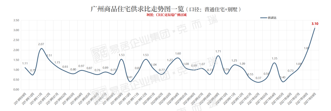不过,也明显看出,今年由于楼市政策的不断调整、信贷环境收紧以及对投资客的炒房行为的打击,截至2021年黄金周,广州商品住宅市场成交转冷,楼市下行信号已显现。