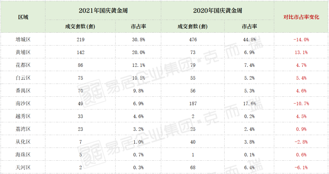 不仅如此,从今年黄金周市占率维度分析,广州各区成交冷热不均,其中增城区、黄埔区为成交主力,市占率均超20%;而海珠区、天河区由于成交量低,排名倒数。要注意的是,以2020年与2021年黄金周的各区市占率作比较,其中,市占率降低比例较大的有增城区和南沙区,南沙区在10月1-7日仅网签成交49套,相比去年同期战绩(187套)该区市占率锐减了10.7%。