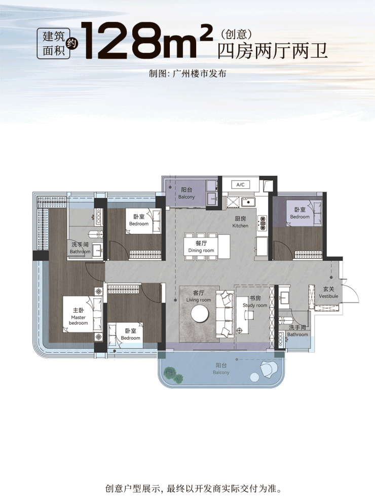 以建面约128㎡四房户型为例,独立玄关空间入户,兼顾归家的仪式感与日常实用性,细节戳中改善需求。