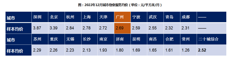 从《2022广州市物业行业发展报告》可见,截至2022年12月,广州物业费均价为2.69元/平方米/月,在一线城市中排名靠后,在全国20个主要城市中排名第六。