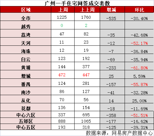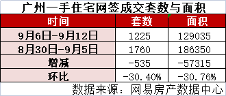 网易房产数据中心监控阳光家缘数据显示,上周(9月6日-9月12日)广州一手楼网签成交1225套,环比上上周(8月30日-9月5日)的1760套减少535套,环比下降30.4%。