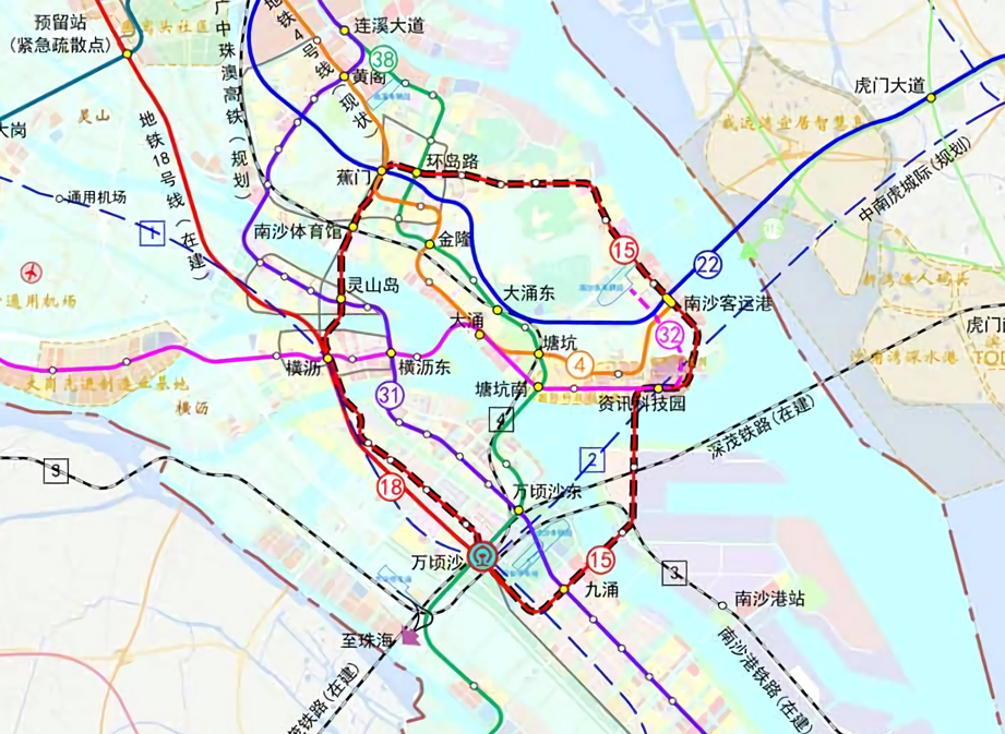 相关规划显示,现阶段38号线计划起于黄阁的莲溪大道,终于十六涌,与4、15、18号线均可换乘两次,其中4号线是飞沙角站、塘坑站,15号线是蕉门以东的规划站、南沙站,18号线是万顷沙站(南沙站)、十六涌站。