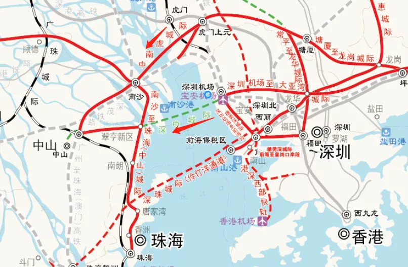 中南虎城际全长约54km,经过南沙、东莞、中山。其规划与虎龙城际(东莞虎门-深圳龙岗)连接,可增强南沙对珠江东岸的辐射。