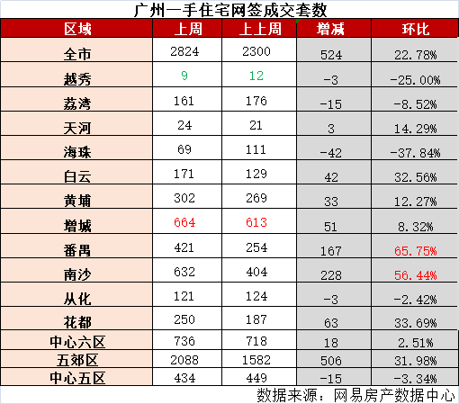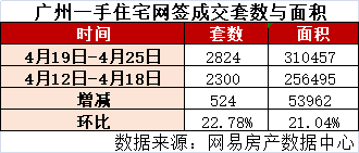 网易房产数据中心监控阳光家缘数据显示,上周(4月19日-4月25日)广州一手楼网签成交2824套,环比上上周(4月12日-4月18日)的2300套增加524套,环比上升22.78%。