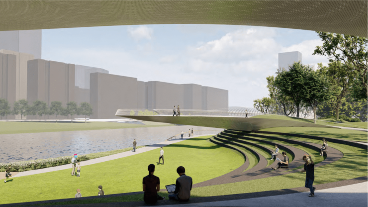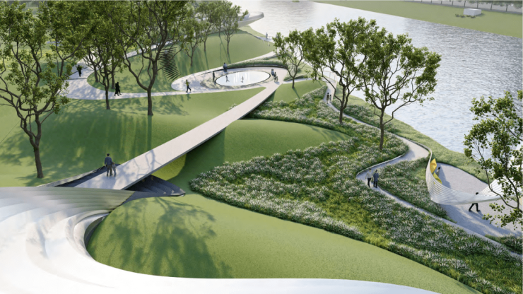 比如其水岸碧道打造,项目引入纽约swa知名设计师团队,秉承着“河流孕育生命”的理念,以“都市山谷,隐秘的繁盛”为主题,大胆地以留白用地打造滨河公园,将建筑融入自然水岸间,赋予项目更多的慢行空间。