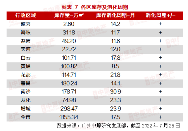 据广州中原研究部统计,截至7月末,广州市库存量1155.3万㎡,去化周期17.5个月,由于成交增速放缓,消化周期、库存量自2022年起明显提升;同时,各区域2020-2021年出让地块陆续转化为新房入市,对库存提升亦起到一定刺激作用。