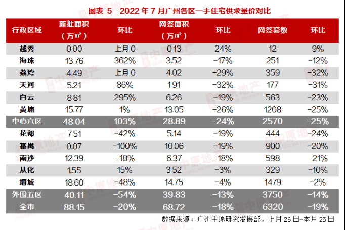 由于近半年各区成交普遍走低,因此库存周期统计出现持续爬升态势;截至7月底,花都、南沙、从化、增城四区库存消化周期超过20个月。其余区域除黄埔区外,均在10个月以上。