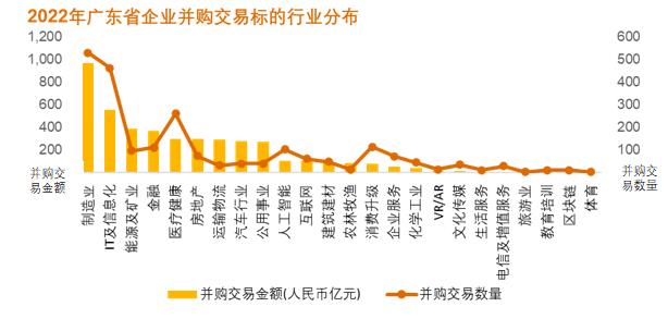 报告显示,从交易金额看,2022年广东省已披露的并购交易主要集中在制造业、能源与矿业、信息科技、金融和医疗健康等领域。
