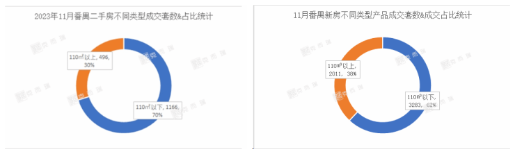 成交结构方面,尽管11月新房成交主力户型为90-110㎡,与二手房相同,但从占比来看可以发现,11月番禺商品住宅110㎡以上的改善户型成交占比38%,要多于二手房的30%,而110㎡以下刚需户型新房占比为62%,少于二手70%。